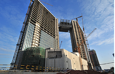 With the successful lifting erection of the structural steel link corridor between the 26th floor of South Tower Building and 30th floor of North Tower Building, the iconic building of Xiamen City has come into being. “Hydraulic whole-body lifting technology” is adopted to lift the link corridor to 114.1m high altitude for one time. The lifting stroke is 80m. It is the first example to lift the heavy structural steel link corridor to high altitude in Fujian Province. This project consists of South Tower Building, North Tower Building and podium building. The total built-up area is about 257,000m2. There are four floors underground. The podium building has 4 floors. Both tower buildings have 30 floors. The total height of buildings is 138.5m. This project passed the evaluation of the fourth batch of “All-China Building Green Construction Model Project” in November.