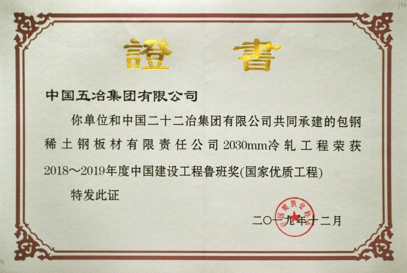 包钢稀土钢板材有限责任公司2030mm冷轧工程荣获2018-2019年度中国建设工程鲁班奖(国家优质工程)