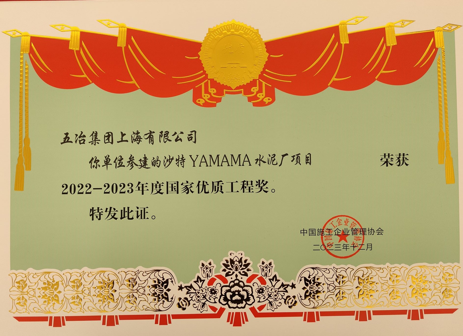 沙特YAMAMA水泥厂项目荣获2022-2023年度国家优质工程奖