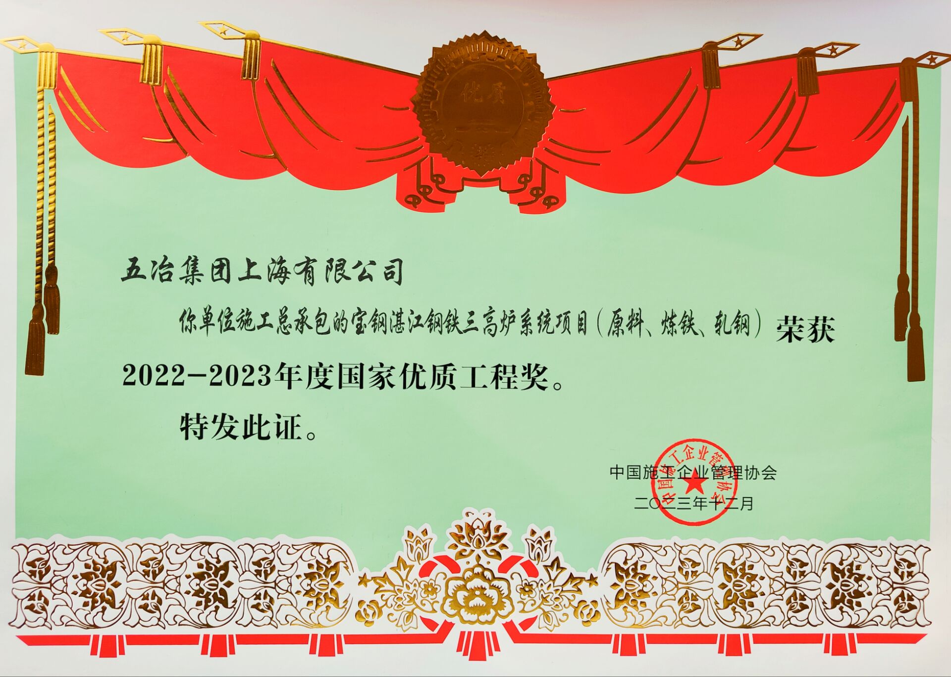 宝钢湛江钢铁三高炉系统项目(原料、炼铁、轧钢)荣获2022-2023年度国家优质工程奖