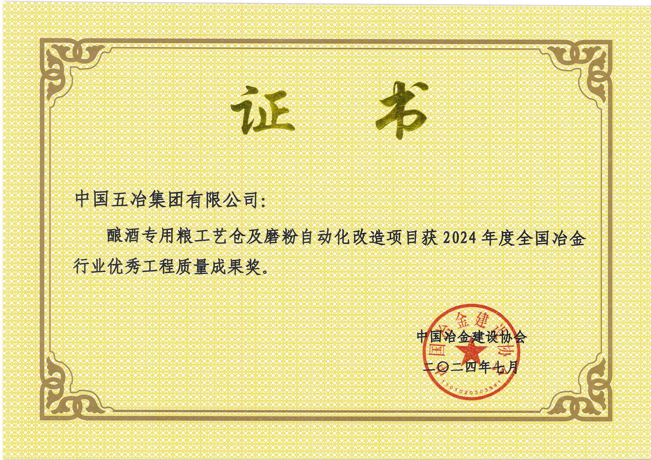 酿酒专用粮工艺仓及磨粉自动化改造项目获2024年度全国冶金行业优秀工程质量成果奖