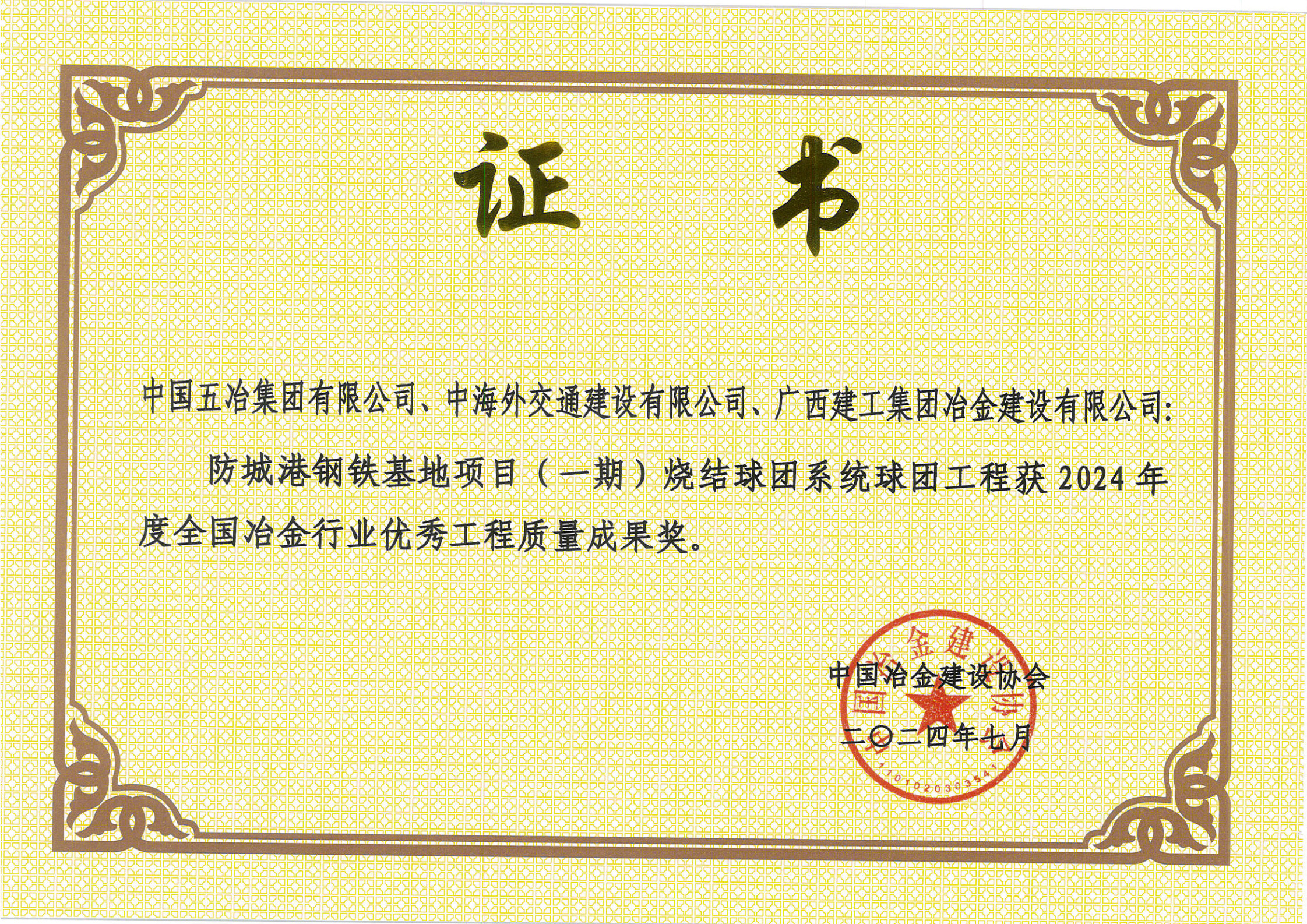 防城港钢铁基地项目(一期)烧结球团系统球团工程获2024年度全国冶金行业优秀工程质量成果奖