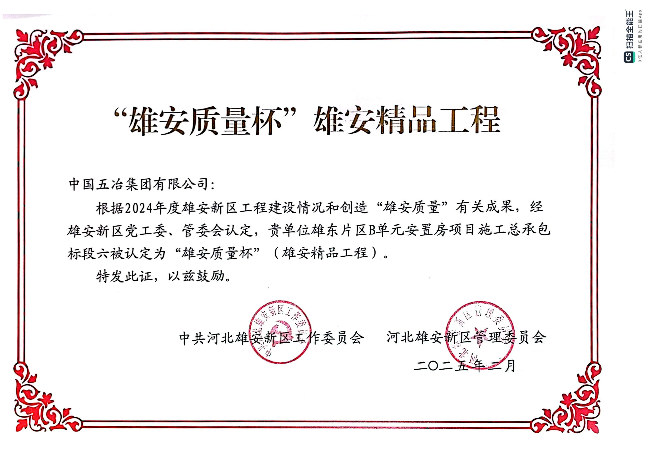 华北公司雄东片区 B单元安置房项目施工总承包标段六项目荣获“雄安质量杯’(雄安精品工程)