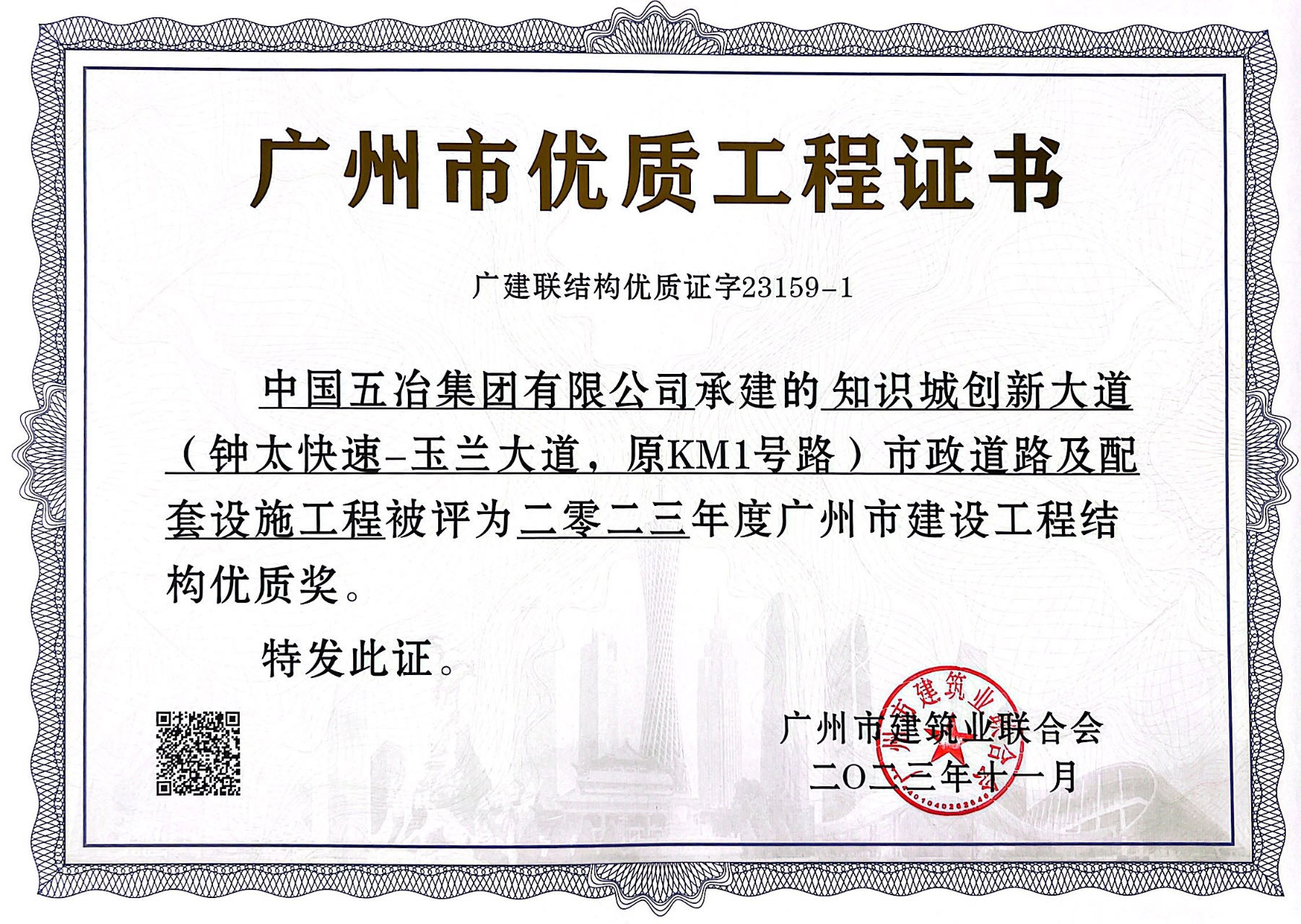 知识城创新大道(钟太快速-玉兰大道,原KM1号路)市政道路及配套设施工程荣获二零二三年度广州市建设工程结构优质奖