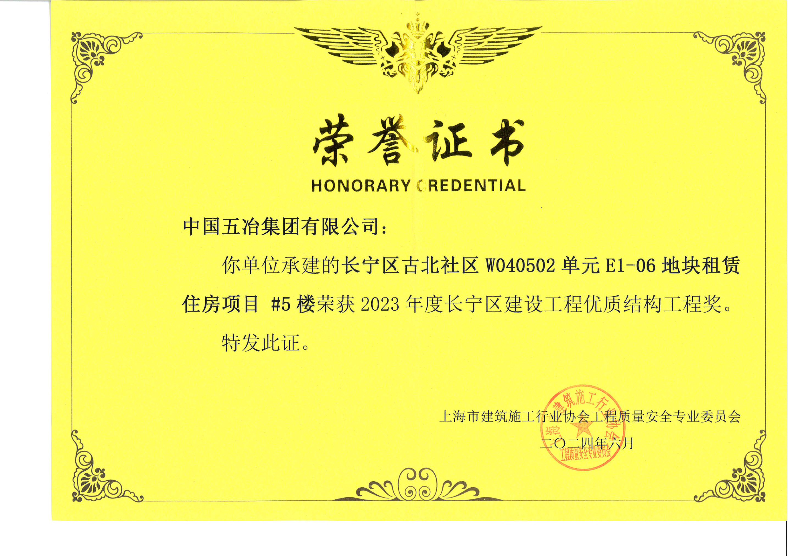 上海分公司长宁区古北社区W040502单元E1-06地块租赁住房项目-5#楼荣获上海市长宁区优质结构工程