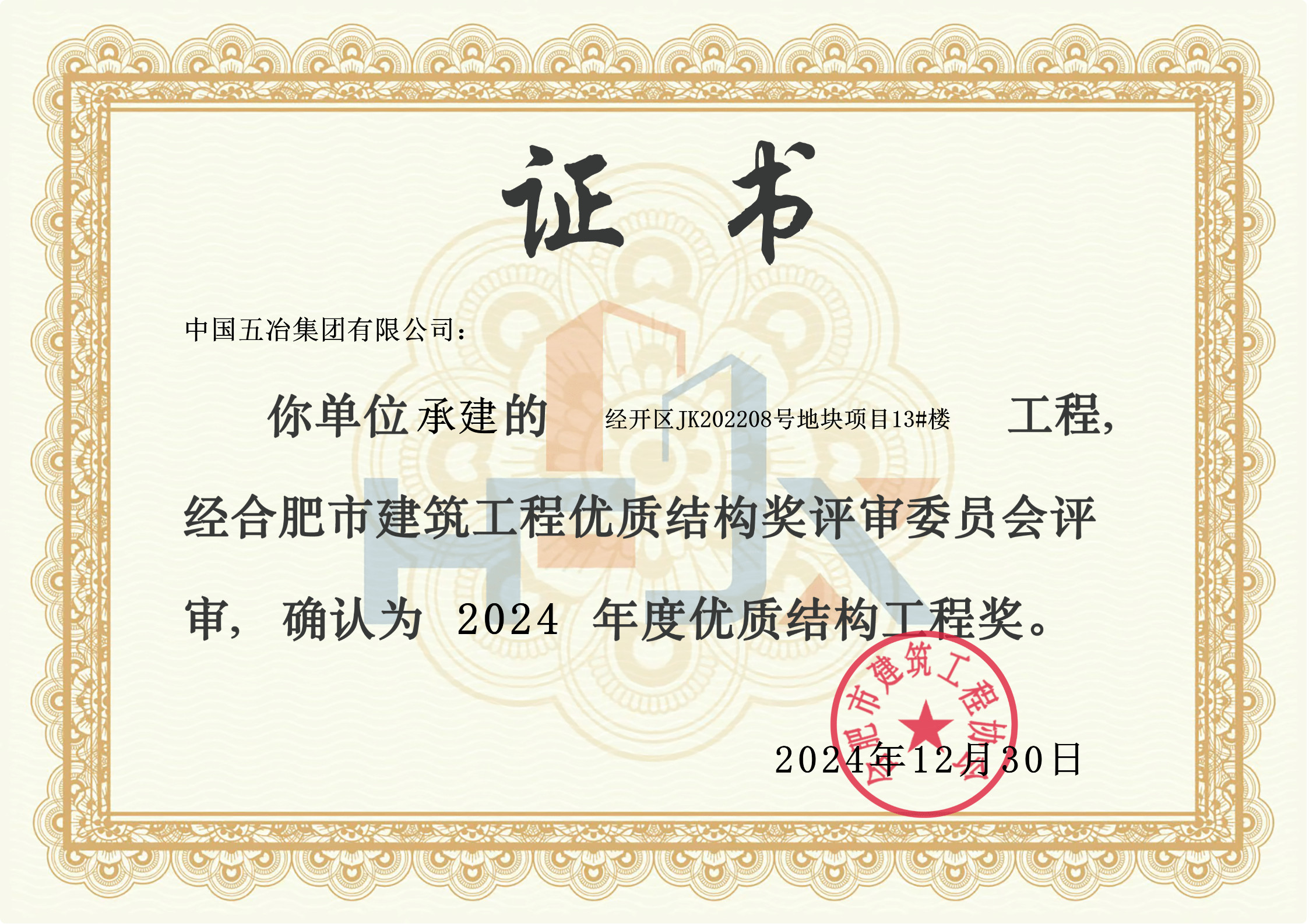 建筑公司合肥市经开区JK202208号地块EPC工程总承包项目13#楼荣获合肥市优质结构工程