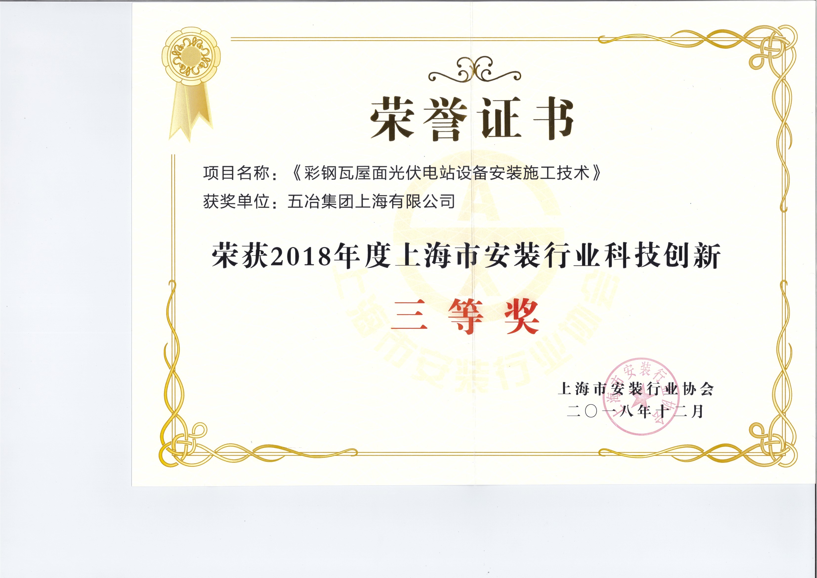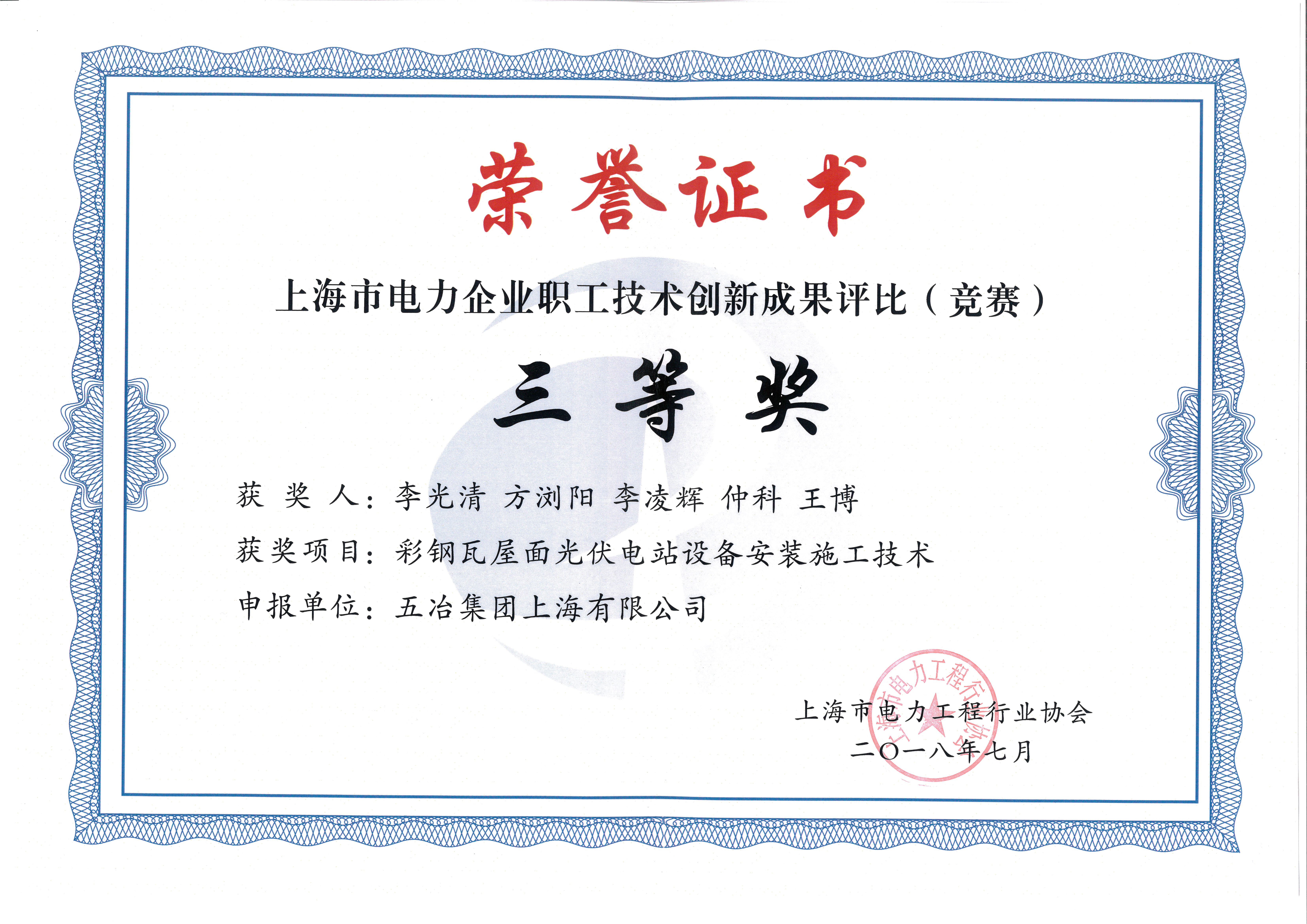 上海市电力企业职工技术创新成果三等奖(彩钢瓦屋面)