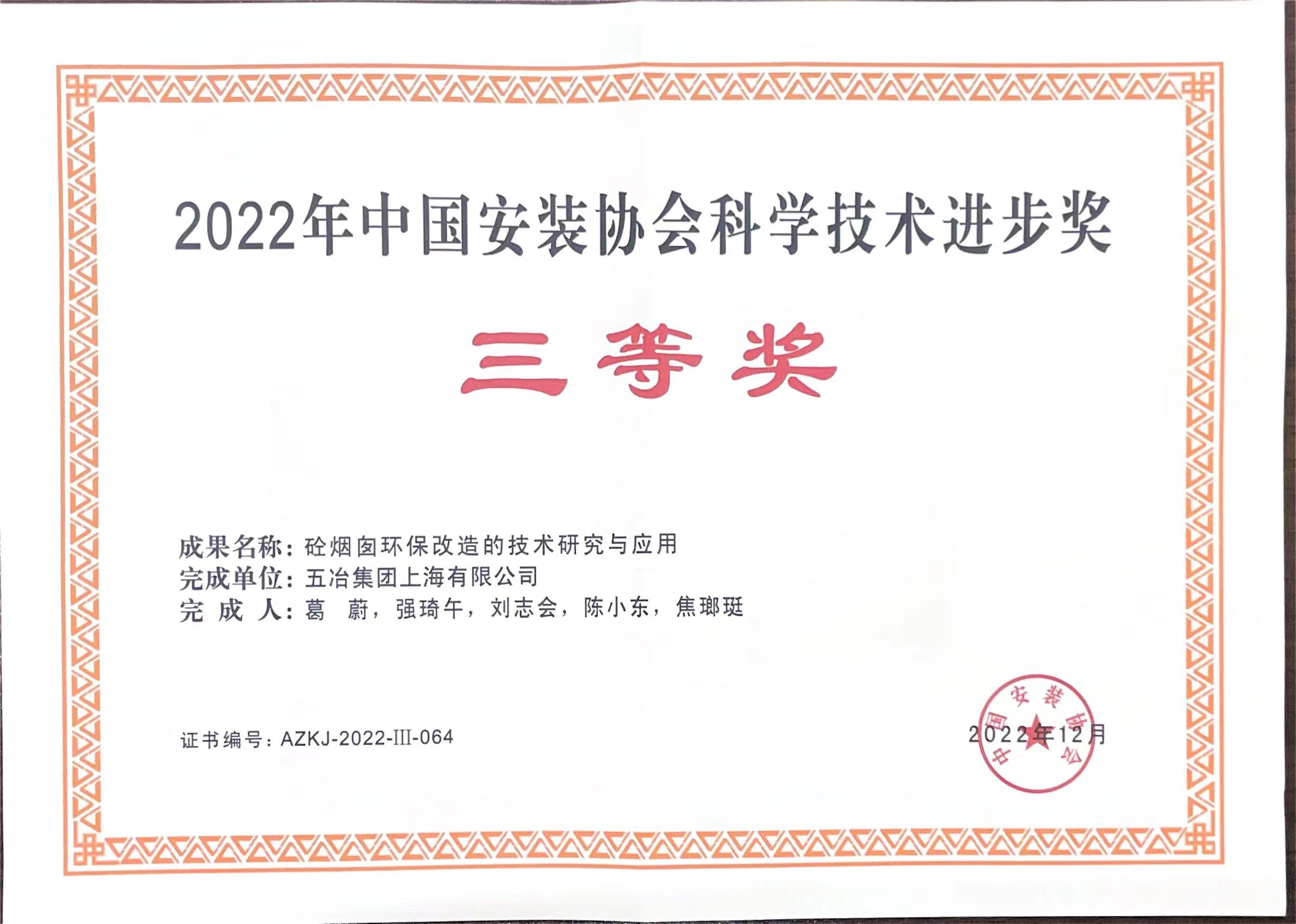 2022年中国安装协会科学技术进步三等奖-砼烟囱环保...
