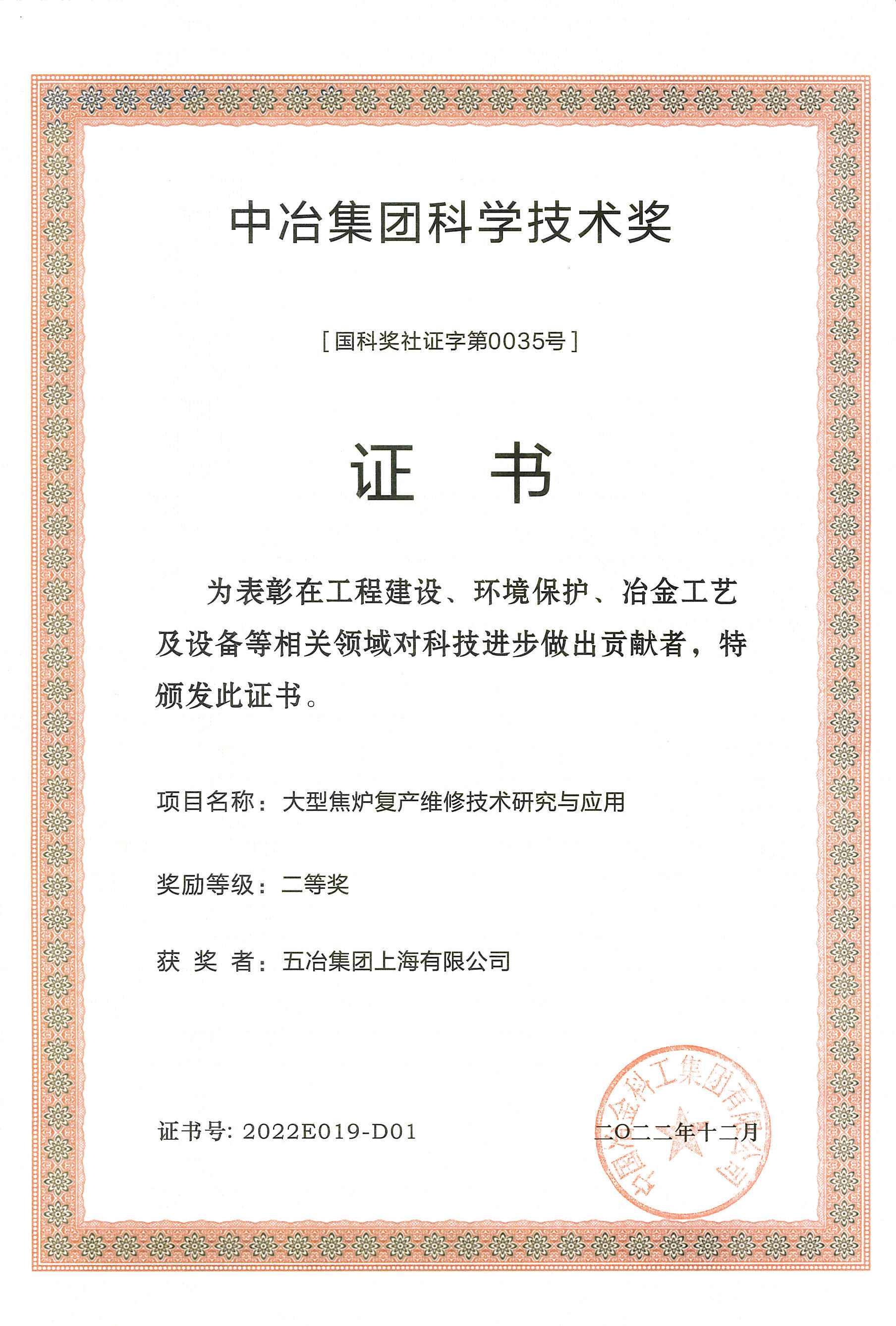 2022年中冶悟空手机平台科技进步二等奖-大型焦炉复产维修技...