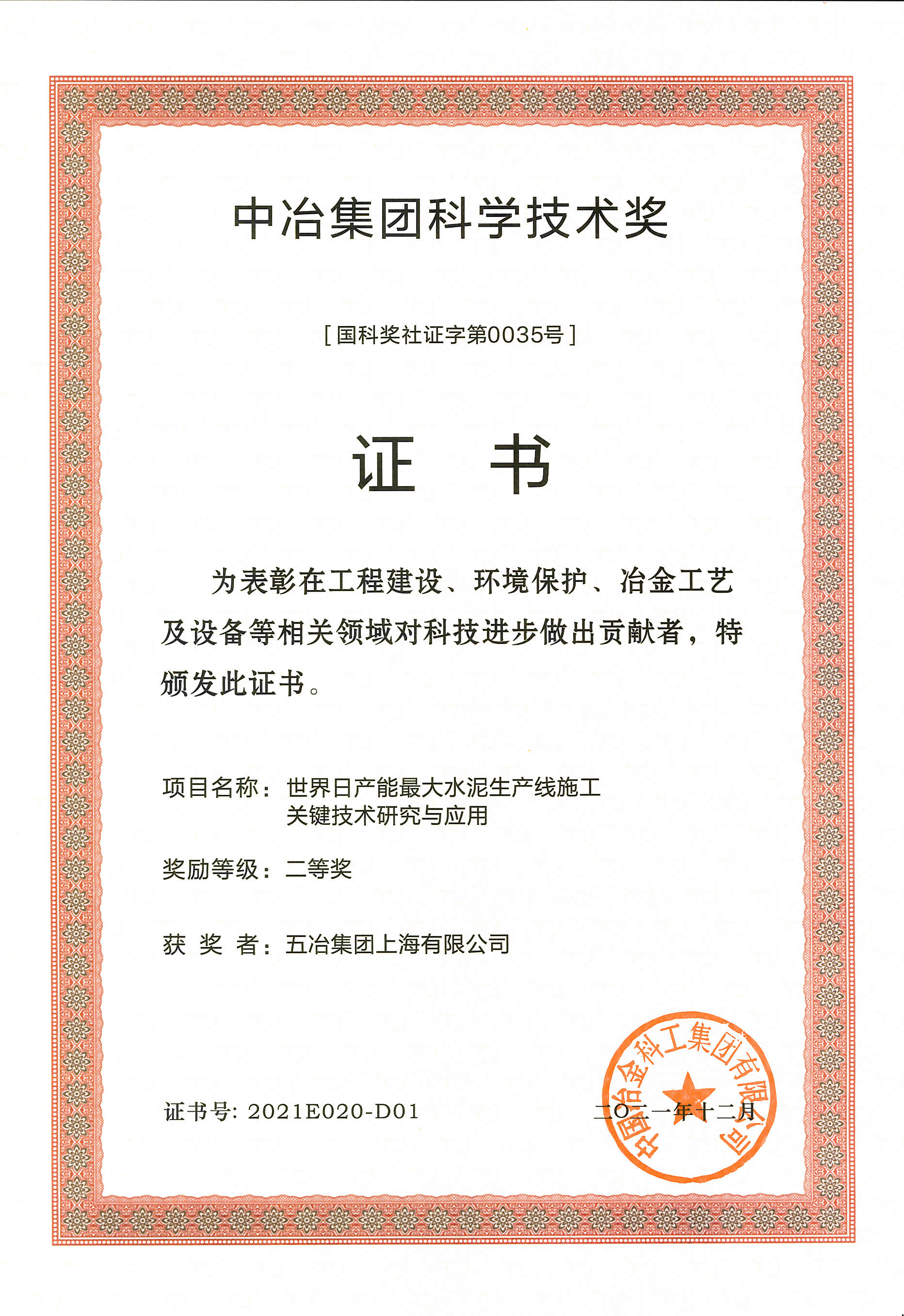 2021年中冶科技进步二等奖-世界日产能最大水泥生产...