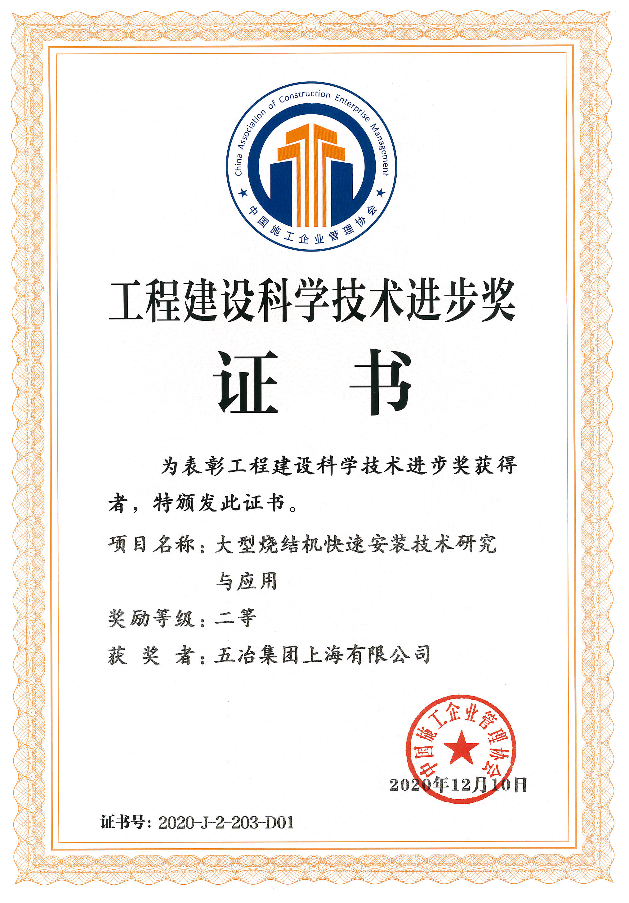 2020年中施企协二等奖证书-大型烧结机快速安装技术...
