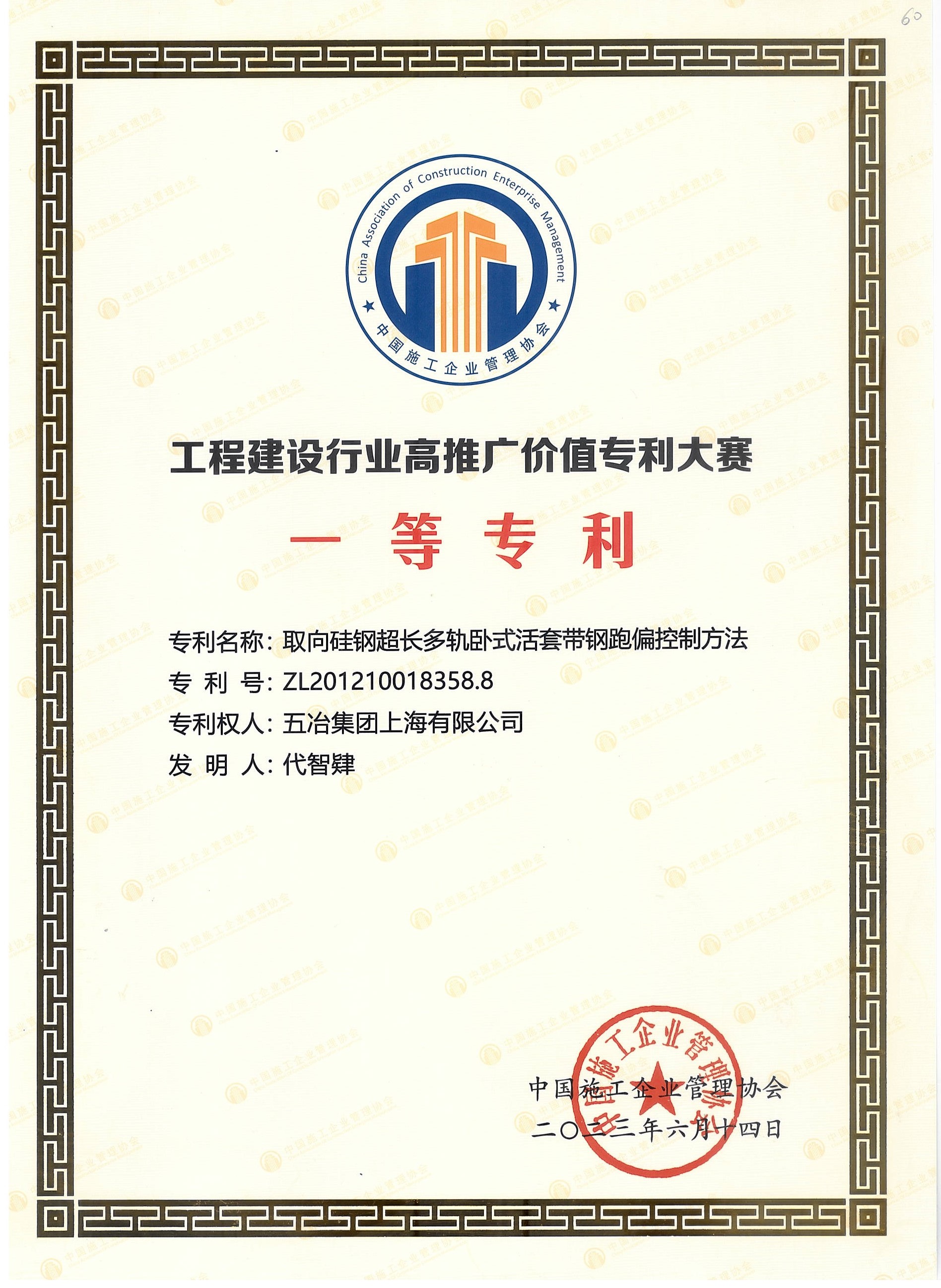 2023年中施企协高价值专利大赛一等奖(取向硅钢超长多轨卧式活套带钢跑偏控制方法)