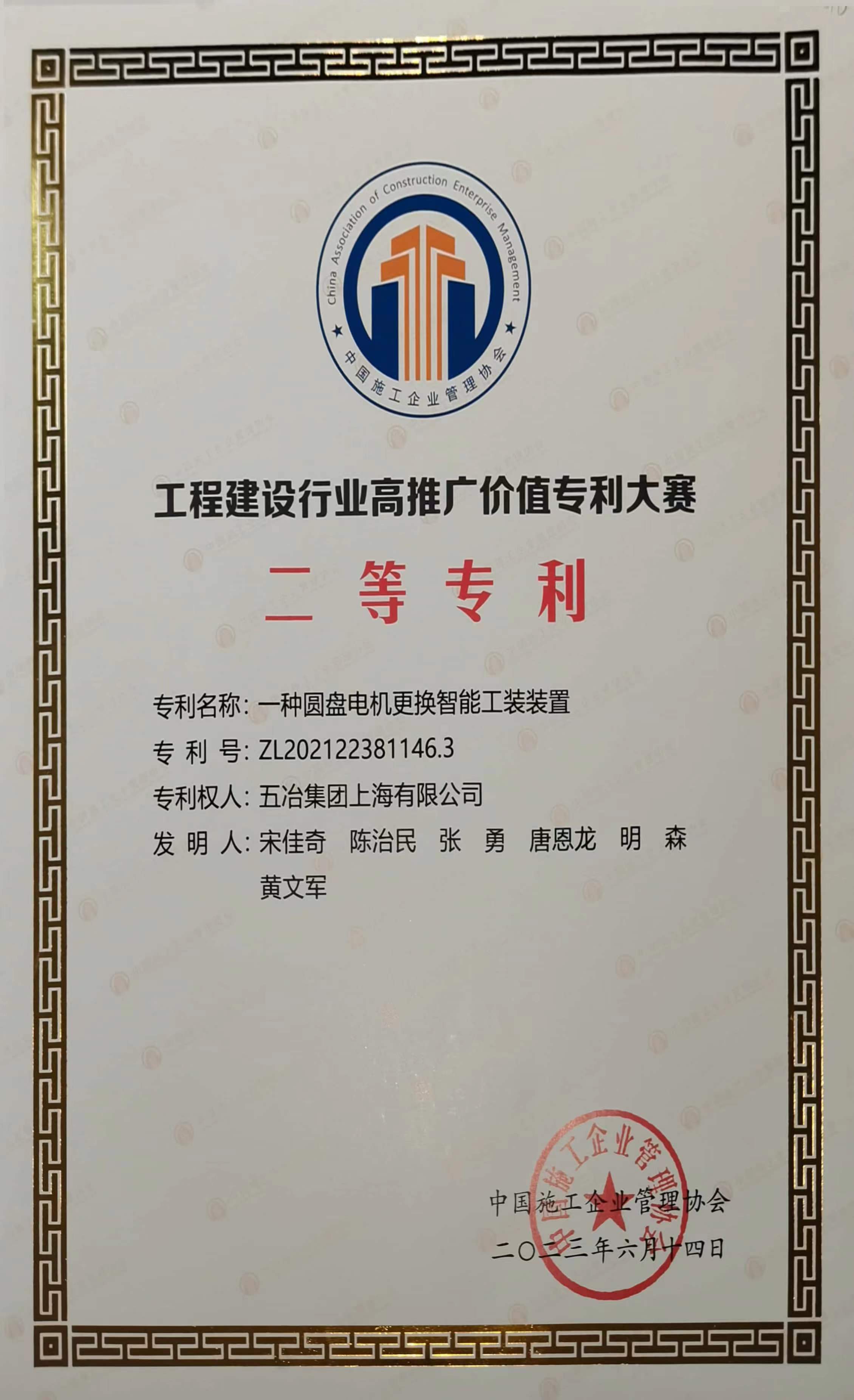 2023年中施企协高价值专利大赛二等奖(一种圆盘电机更换智能工装装置)